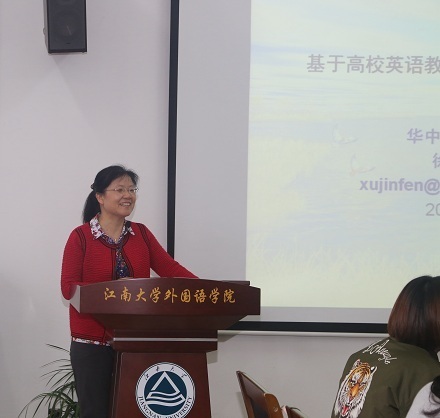 女性教师多的特点从个人家庭主妇身份讲起,分享了如何处理好家庭、教学和科研之间关系的成功经历。然后梳理了从语言教学中师生关系、教师与教材,课堂环境的构建、教学方法、有效教学的特征、优秀教师的特征到教学评估、第二课堂及“互联网+”时代的学习等大学英语教学中所涉及的热门话题,并进一步就可以开展研究的方向及需要深入了解的理论框架做了详尽的介绍,同时徐教授还以她近年来发表的多篇SSCI、CSSCI高水平论文为例,强调大学英语教学及研究本身就是每一个大学英语教师的事业,老师们要有培养敏锐的研究视角、打下扎实的教学实践和理论研究基础。