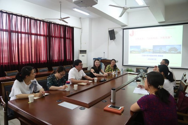 ,调研学习大学外语等课程设置、改革以及人才培养方案方面的经验。院长龚晓斌作了题为《大外改革:各取所需,个性发展》的报告。施惠平副院长、拓展部谢竞贤主任出席交流会。