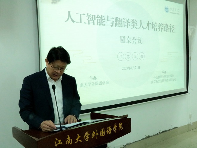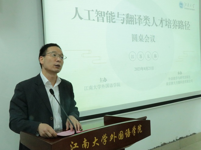 随后,在孙志祥教授的主持介绍下,西交利物浦大学张霄军教授和华为2012实验室南研分部张建农部长分别作了发言。张教授从人工智能给教育带来的震动以及高校教育者如何应对这一问题两个方面,对人工智能时代给翻译教学带来的革新与启示发表了看法。张教授通过“大型语言模型(LLM)”工作原理以及学界对抄袭的定义标准来解释人工智能可能带来的影响,并给出了立法规范人工智能使用的应对方案。此后,张建农部长以“人工智能革命大场景下需要怎样的翻译人才以及如何培养”为主题发表演讲。张部长首先对翻译1.0到4.0的不同含义进行了阐释,介绍了集自然语言处理能力和知识储备为一体的人工智能对传统翻译带来的挑战;接着从学校教育、翻译企业等方面阐明翻译行业对人工智能技术的积极响应;最后结合自身经历对翻译人才培养给出了相关建议,表示学生应当关注国际咨询、学习优秀人才思维模式。