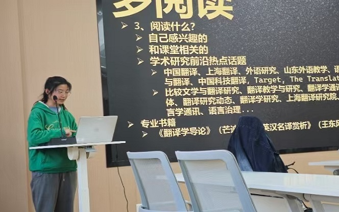 活动伊始,语言学、文学、翻译三大领域的同学们轮流上阵,为与会者带来了一场精彩纷呈的学术分享。其中,朱紫菱同学以语言学研究的视角,深度剖析了“论坛参与”与“论文投稿”两大核心议题。她不仅详细阐述了参与各类学术论坛的多元渠道,鼓励研一新生积极融入学术圈,拓宽视野;还贴心分享了向国外期刊投稿的宝贵经验,诸如撰写declaration statement的技巧、尊重编辑的重要性等,为同学们的学术之路点亮了明灯。