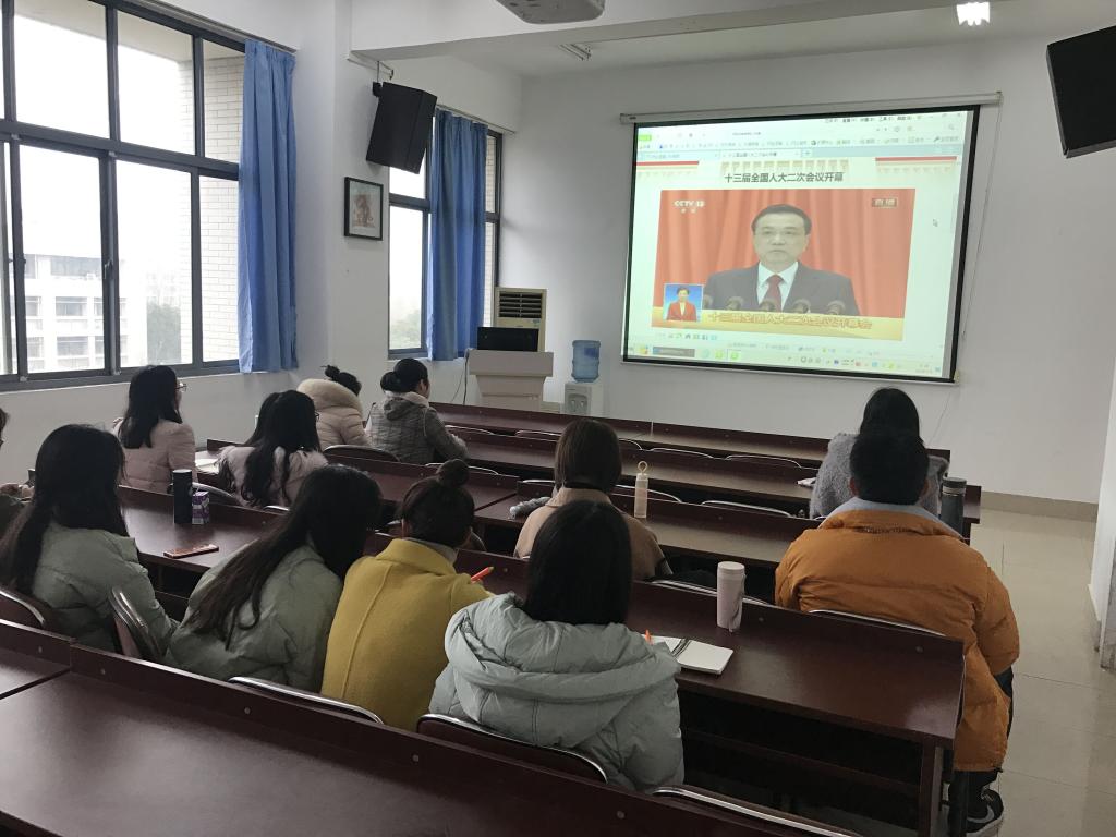 组织各学生党支部学生党员在学院A433集体收看两会直播视频。学院分团委辅导员老师黄颖、张圆也和同学们一起收看直播,学习两会精神。