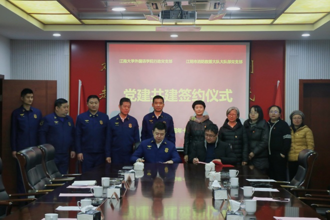 行政党支部书记季王飞、江阴市消防救援大队大队部党支部书记陈俊宏签署党建共建协议。党支部双方成员共同开展学习习近平同志《论教育》,习近平同志关于总体国家安全观的重要论述。