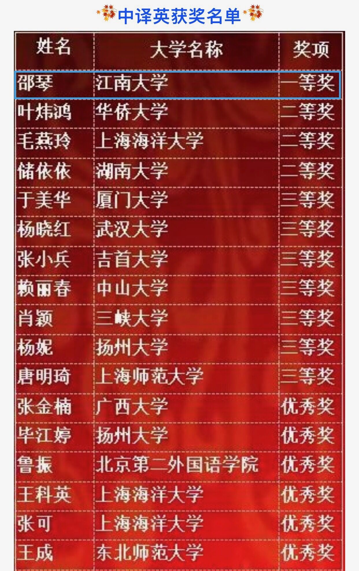 英语专业16级学生邵琴同学夺得桂冠,荣获“汉译英”组一等奖。