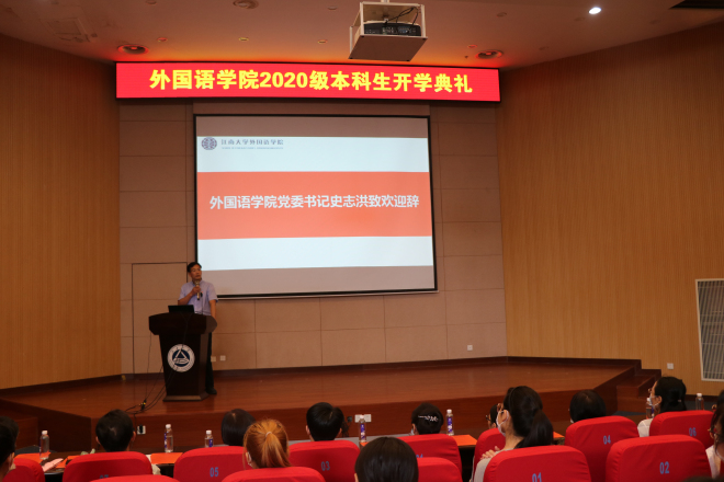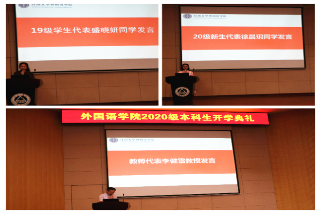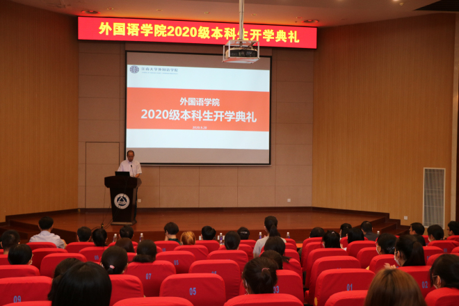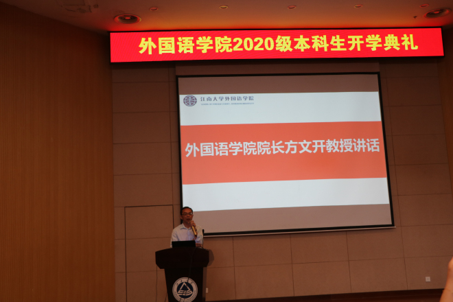 开学典礼开始前,参加典礼的师生进行现场测温,并采取隔位的方式安排座位。大会在庄严的国歌声中拉开帷幕。首先,由学院党委书记史志洪致欢迎辞。史书记首先欢迎2020级新生加入外院大家庭,在谈到如何过好大学生活时,史书记指出:大家要坚定理想信念,做好当下的学业规划,在前行的路上不断挑战突破自己。之后,由教师代表李健雪教授发言。李教授主要分享了青年的学习状态和青年人的理想,“树立远大理想,专业上科学学习方法,青春不留遗憾”引发了新生们的思考。在学生代表发言环节,19级学生代表盛晓妍同学用三组词——人与众、忙与闲、星空与大地给新生们提出了中肯的建议。20级新生徐晨玥同学代表全体新生站在新的起跑线上热情发言,表达了对未来学习生活的憧憬。会议最后,院长方文开教授以“道”为切入点,为新生解读了“笃学尚行,止于至善”的江大校训,分别从为学、为世、为人三个方面给新生提出期望。最后方院长说:语言的学习要注重融合,在明确目标的基础上要指定详细的计划,大学期间多读经典著作。
