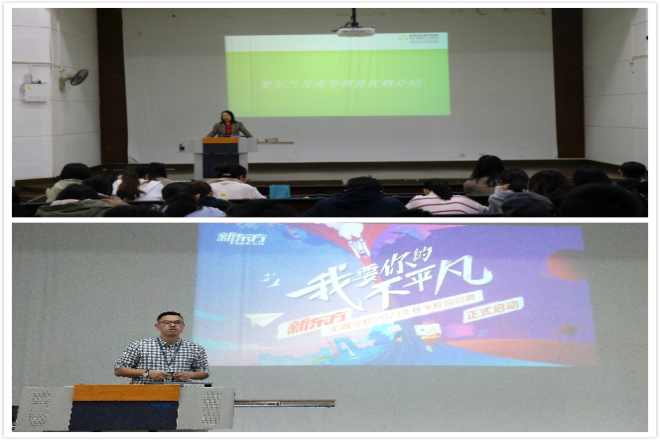 会议第二部分,江达留学代表分析了爱尔兰留学项目及爱尔兰高等教育优势,简要分享了圣三一学院,都柏林、爱尔兰国立高威等大学的学习情况。最后,新东方教育集团企业代表介绍了新东方内部基本情况,结合招聘需求阐释了当前的就业形势,鼓励同学勇敢尝试,挑战自我。