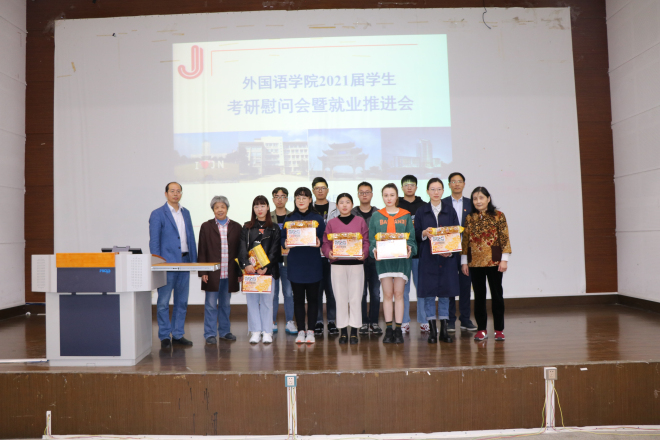 往届毕业生数据情况,为处于冲刺阶段的考研学子注入新的动力,为求职学生传递正能量,并向所有同学们表达了祝愿与期待。随后,学院领导老师与关工委退休老师一起为考研学子代表送上慰问品并对同学们进行温暖鼓励。