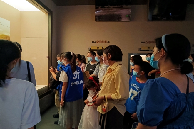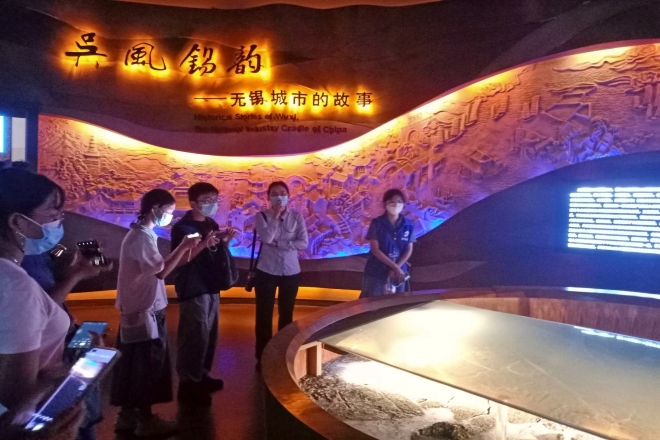 下午1时,青协志愿者顶着高温,在博物馆门口组织学生签到。入馆后,新生们纷纷合影留念,兴奋溢于言表。在馆内,讲解员与同学们一同探索无锡的“前世今生”。从原始时期的马家浜文化、崧泽文化和良渚文化到春秋战国时期的吴越之地;从唐宋时期江南的农产丰收富饶到明清之际无锡商业经济发展。