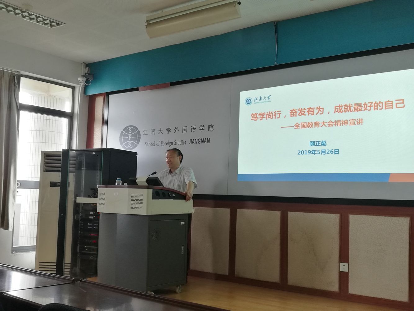 顾副校长从最近的热点话题“中美贸易战”,回顾中美贸易战的演化过程,指出其本质是美国对中国的高科技产业发展的抑制,其目的是限制中国的发展,此贸易战归根结底还是国力的竞争,是科技、人才和教育的竞争。从而引出本次授课主题“笃学尚行,奋发有为,成就最好的自己---全国教育大会宣讲”。