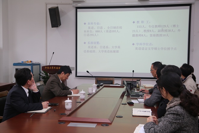 会上,龚晓斌院长首先从师资队伍建设、大外教学改革、英语日语专业建设、学生工作、社会影响以及存在的问题尤其是大外教学改革方面全面介绍了学院近年来的改革发展情况。朱书记不时插话,就学院师资队伍、招生升学和项目申报等问题进行详细了解,他认为学院的英语日语专业在当前的国际背景下有很大的发展空间,指出一个学校在学生心目中的地位主要看学校能为他们提供什么,创建“双一流”大学,人才培养工作要做得扎实,要鼓励学生有更宽阔的视野和更远大的追求。