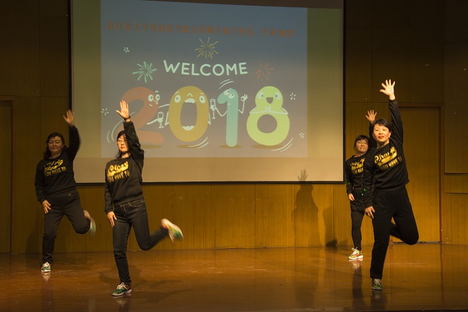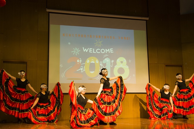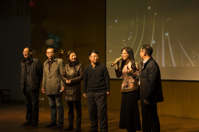 经过一个月的筹备,老师们利用业余时间,充分发挥各自的聪明才智,以组织课堂教学的认真态度,通过网络等多渠道的学习,利用学校人文专业的资源,研究了服装、道具、配乐等舞台效果。节目的上演便如同考试,也被视作“我们自己的春晚”,大家都分外投入。节目形式多样,舞蹈、朗诵、合唱,有西洋乐器演秦,也有传统快板的敲击。参与演员,有外籍老师,有师生同台,有即将退休的年长同志,也有刚入职首次亮相的青涩新人,有头发稀少的教授,也有身姿优美的丽人。每个人既有演出,也当观众,学院中层干部纷纷登台,台上台下热情互动,情谊交融,活动圆满成功。