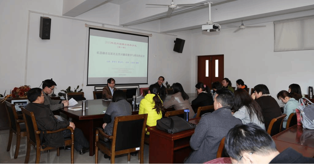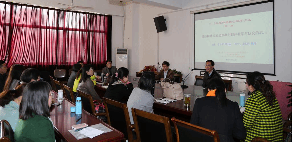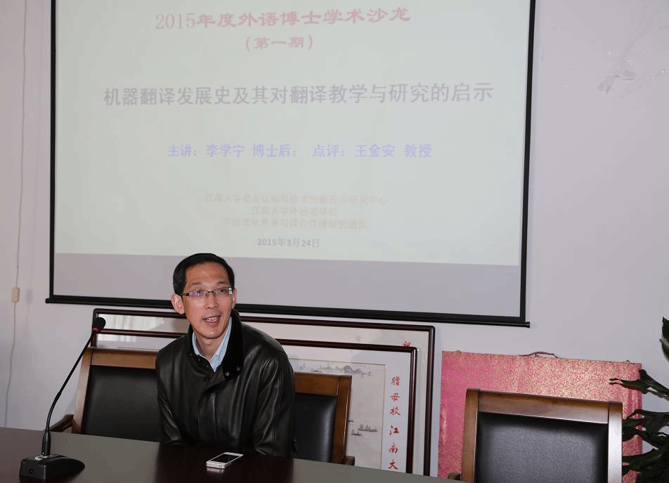 随后,李学宁博士做了“机器翻译发展史及其对翻译教学与研究的启示”的主题讲座。李博士从索绪尔《普通语言学教程》的历史意义与数学之于语言研究的重要性谈起,借鉴语言学、数学、计算机科学甚至哲学的思想与成果来系统寻踪并客观分析了机器翻译的发展阶段、主要人物、重要概念、本质属性、翻译标准、课程开设、市场开发以及对翻译教学与研究的启示。李博士的讲解深入浅出、旁征博引、讲解风趣、举例生动,受到了参与者的一致好评。在老师们和李博士进行了简短的互动后,王金安教授以其开阔的学术视野、深厚的理论功底与精辟的语言文字对李博士的讲解与该场学术沙龙进行了精彩点评。沙龙最后在老师们的自由交流中落幕。
