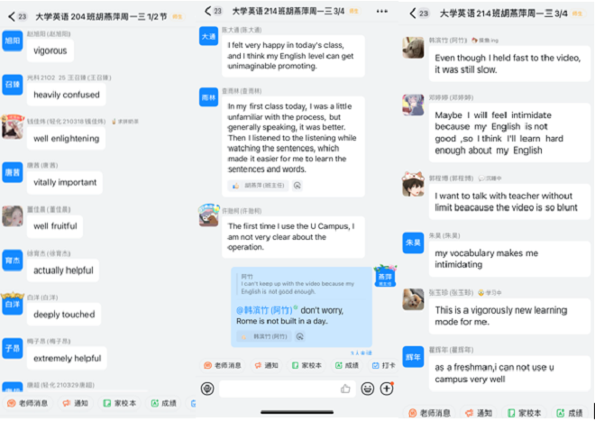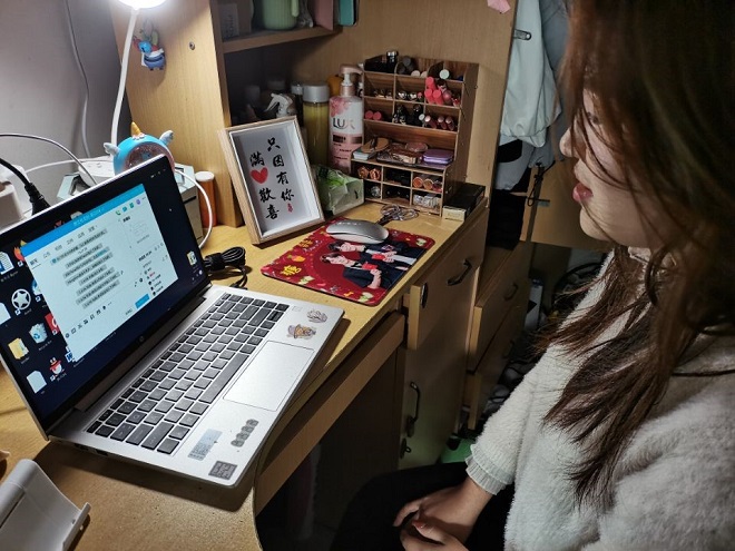 有序组织安排。英语系、日语系进行了周密部署,一方面按照学校要求,建立课程钉钉群和备份教学平台,并组织了课前测试,另一方面,通过学校慕课平台、学工、学生等多条沟通渠道,保证学生及时入群并接收课程通知及消息。同时,老师们通过课程群在线备课,争取开学第一课的顺利进行,保证课程的教学质量。从周一开始,各位任课老师都以极高的热情投入教学工作,没有出现设备故障或教学延迟等事故。暂缓返校的同学照常学习,“在网课前两天我配合老师工作,使班上同学全部及时入群,在班级群提醒签到等任务,并组织负责每天晚自习的打卡。从每天早八的早起开始,在完成学习任务的同时我也积极敦促自己养成自律的习惯。”选择返校的学生认真投入:“各自在宿舍里认真上网课,上课时互不打扰,但会相互监督提醒。大家一起进步的学习氛围很好。”学生纷纷反映“老师们的准备非常充分,即使是网课,也像线下一样和我们互动非常多!”“网络课堂中,同学们更积极了,畅所欲言。而且老师上传的电子资料,直播视频都给我们提供了更多更方便的学习渠道。”