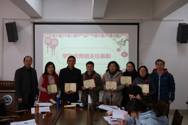 随后杨艳老师就2019年学院学生工作进行总结汇报。她从班级建设、学风建设、团支部建设等方面回顾了2019年的工作,具体解读了学校班主任工作条例、优秀班主任评选办法等文件,宣读了2018-2019学年获奖班主任名单。学院党委书记黄城芳、党委副书记刘伯贤为获奖班主任老师颁奖。
