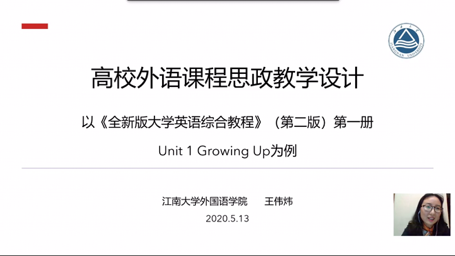应上海外语教育出版社邀请,进行积极部署与精心组织,推荐王伟炜老师向全国大学英语教师展示全新版大学英语(第二版)第1单元的课程思政设计。