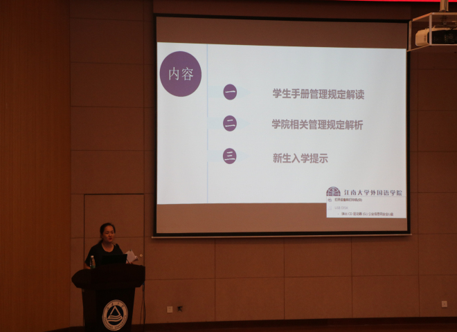 首先,滨湖区公安分局内保大队副大队长乔智勇通过防诈骗的方法、校园贷的危害以及毒品的危害给新生上了一堂安全教育课,过程中以实际案例为新生介绍了常见的诈骗手段以及预防诈骗的方式。然后,学院教学秘书王琰玲老师从“人才培养方案、学籍信息管理、选课与退课以及课程考核与评教”四个方面为新生进行学习管理指导。学院分团委书记杨艳老师为新生详细解读了学生手册,并介绍了学院的具体管理规定,让新生对学校、学院的管理制度有了深入的了解,同时19级辅导员苗文建老师也进行了新生注意事项说明。最后,院党委副书记刘伯贤老师进行大会总结,刘书记强调:进入大学后要尽快适应大学的学习生活,转变身份,转变认识,严格按照学校、学院的相关要求,成长为一名优秀的大学生。