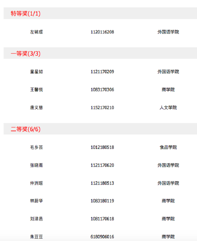 以英语为母语的外籍教师、具有丰富授课经验的写作教师刘梅副教授及资深文学方向教师蒋怡博士,评委们严格按照评分标准对参赛作文进行批阅。根据本次大赛的章程及组委会要求,经过线上评阅及线下评阅,本次校选赛共19位参赛者获奖(获奖名单中同一奖项获奖学生名字非按成绩排序,为Uchallenge系统自动排序)。