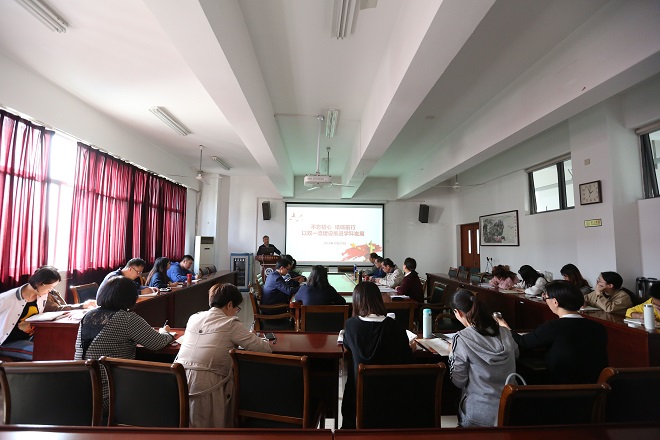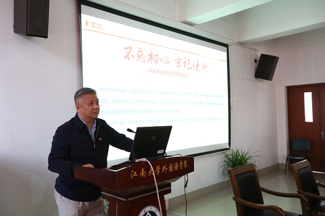 ,为学院师生党员上了题为《不忘初心、砥砺前行,以“双一流”建设推进学科发展》的专题党课,学院党政领导、英语系、日语系教师党员和学生党员代表等30多人现场聆听。