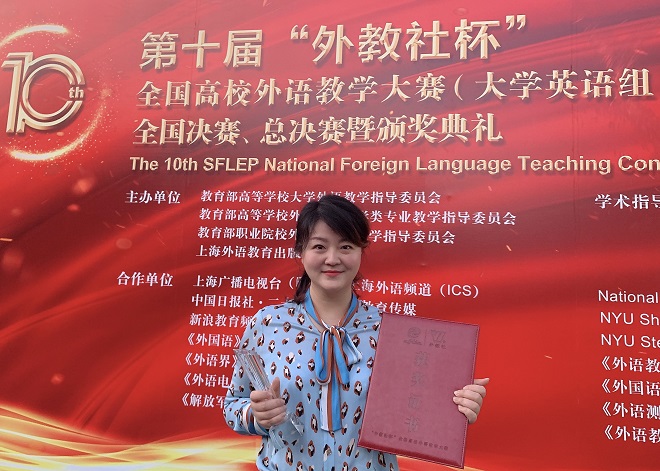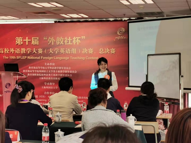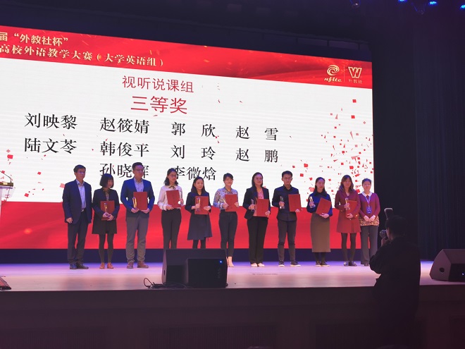 刘玲老师作为江苏赛区的冠军选手,参加了本次顶级赛事的角逐。刘玲老师顶住了第一个出场的巨大压力,展示了精妙的课堂设计、良好的师生互动、清晰开阔的教学思路,最终荣获大学英语视听说组全国总决赛三等奖,实现了我校外语教师在国家级讲课比赛中零的突破。
