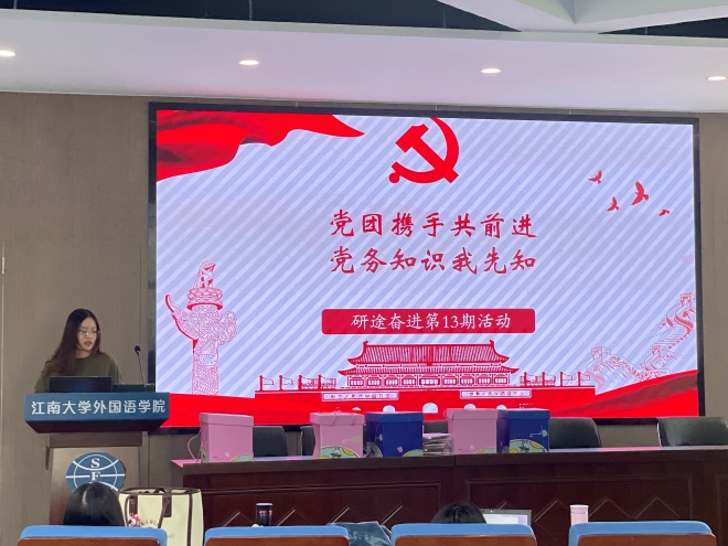 第十三期“研途奋进”活动在君金报告厅成功举办。本次活动围绕党团共建展开,主题为“党团携手共前进,党务知识我先知”,21级、22级硕士研究生与英语2101“张闻天特称团支部”全体成员共同参与了此次活动。