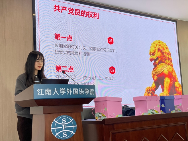 刘澍蕾同学带领大家一同学习了党员的八项权利与八项义务。她提到,党员的权利与义务是一个相互联系、不可分割的整体,是互为条件、相互促进的关系。通过解读党员的各项权利与义务以及《中国共产党章程》中对党员权利与义务的调整,引导党员同志正确行使权利,规范履行相关义务,更好地把握权利与义务的关系,增强责任党员意识。同时,刘澍蕾同学的宣讲也促使各位入党积极分子和准备入党的同学正确认识自己,不断鞭策自己向党员的标准靠近,早日达到入党所需的条件。
