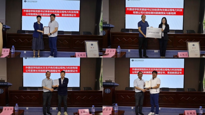 党委副书记刘伯贤向无锡云程电力科技有限公司行政经理刘丽颁授校外教学实习基地牌。
