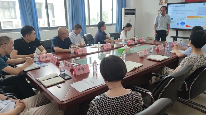 李荣华对刘张飞、赵从义一行来访表示热烈欢迎,并简要介绍了学院党建与思政工作。方文开从大学英语教学改革、学科建设、专业发展、科学研究、人才培养和未来思路等方面对学院整体情况作了全面介绍。班子其他成员围绕自身分管工作分别做交流发言。