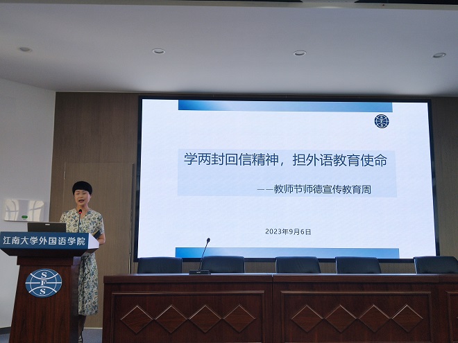李荣华书记以“学两封回信精神,担外语教育使命”为题,开启了学院师德教育宣传周系列教育活动。李书记带领大家重温了习近平总书记给北京外国语大学老教授的回信和习近平总书记给外文出版社的外国专家的回信,勉励教师们努力培养有家国情怀、有全球视野、有专业本领的复合型外语人才,履行外语人使命担当,做好中华文化外译和外宣,促进学院奋进发展。