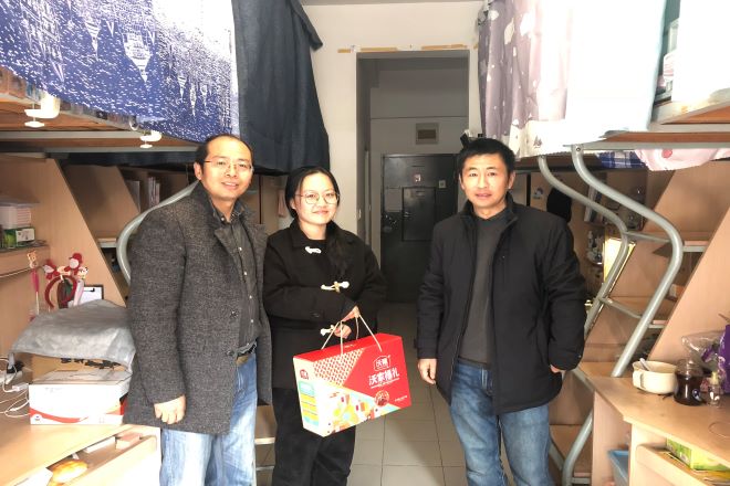 今年寒假期间学院有两名学生因疫情防控、考研学习需求留校。戴月波书记走进学生宿舍详细询问了学生目前在校的生活、学习情况,表达了学校对于寒假留校学生的关心,并为两名学生送上新春慰问礼包。在得知王宇翔同学留校学习准备考研时,戴书记鼓励他做好学习规划,向榜样看齐,并预祝他考取心仪学校。在和杨雁华同学交流中,戴书记嘱咐在疫情防控期间要按照统一部署,提高防范意识,做好科学防护,留校期间要多与家长电话联系,学习生活中的困难要及时和辅导员老师交流,遇到困难随时向学院反映。交流过程中,学院党委副书记刘伯贤表达了学院对于寒假留校学生的关心,同时鼓励大家好好利用寒假时间学习,争取在考研和求职中取得新突破。