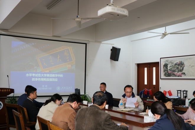 紧接着,常辉教授分别从测试在教学中的抓手作用,英语能力构念,校本测试的优势和必要性,以及英语水平考试及其反拨效应四个方面详细阐述了水平考试。常教授指出大学英语是一个学、教、测一体化,三者互相影响、互相制约的系统,做好大学英语改革必须同时做好这三方面的研究工作。最后,常辉教授就上海交通大学水平考试的具体情况和数据进行剖析,将水平考试分为三个阶段,一是2010年至2015年,学生考试情况并不乐观且意见较大,教学内容与考试脱节,但四六级成绩好。二是2016年以来,系统逐渐成熟稳定,效果显著,水平测试逐渐形成十大特色。三是未来计划,学校将继续致力于完善水平考试,并能够服务兄弟院校,共同发展,服务于祖国人才培养。