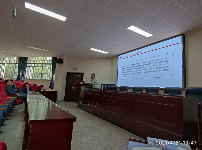 在文科楼B103召开师德师风警示教育大会,会议由党委书记史志洪主持,院长方文开主讲。