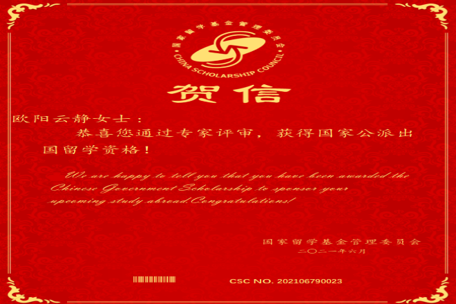 学子不负众望,捷报频传。其中,2021届硕士毕业生欧阳云静同学成功申请到英国格拉斯哥大学的翻译学博士研究生,并经国家留学基金委专家评审,录取为2021年国家建设高水平大学公派研究生项目(与英国格拉斯哥大学合作奖学金)出国留学人员,同时,2021届硕士毕业生李贵洁同学被西南大学外语学院英语语言文学录取为博士研究生。
