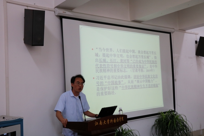 陈伟教授首先从传播学跨学科的角度,基于以习近平同志为核心的党中央提出的高度重视文化建设的指示,介绍了中华文化符号的传播意义和价值,明确了外语人应该具备何种敏感性树立、何种全球观,通过文化符号,传播优秀文明。