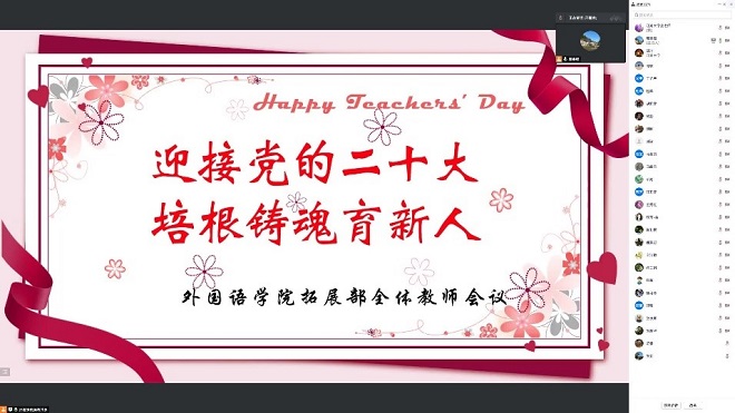 大学英语拓展部全体教师于9月8日下午2点,相聚云端,以 “迎接党的二十大,培根铸魂育新人”为主题,进行了立德树人研讨活动。动漫屋
