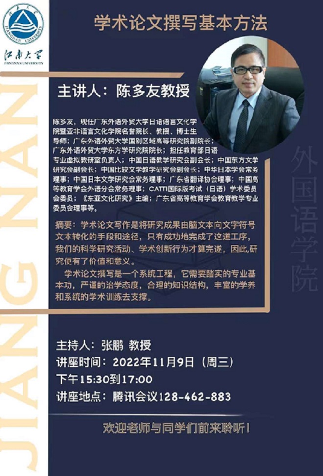 11月9日下午,教育部外国语言文学教学指导委员会日语分委员会委员、广东外语外贸大学东方研究院院长陈多友教授应邀为动漫屋