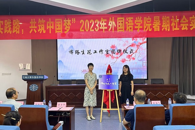 李荣华与顾海星为“译路生花”工作室揭牌,打造“外语话家乡”社会实践特色项目。