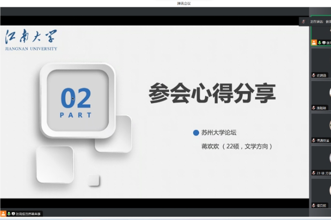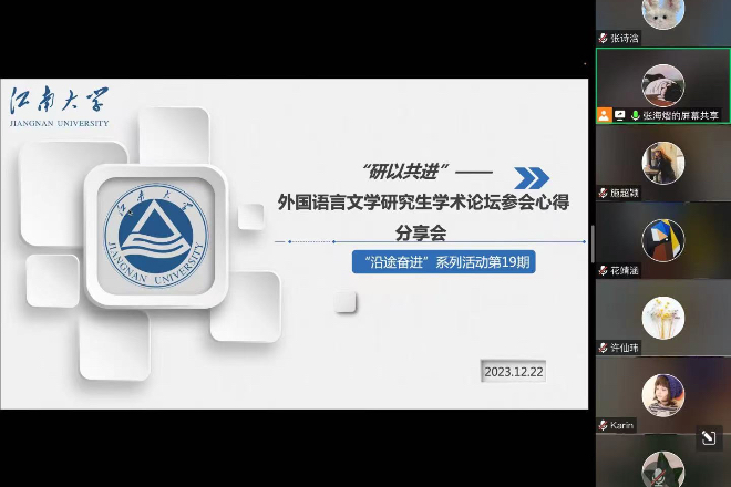 “研途奋进”第十九期活动在腾讯会议线上成功举行。学院全体硕士研究生参与了本次活动。此次活动的主题是“研以共进”外国语言文学研究生学术论坛参会心得分享会,共分为四个环节:谢竞贤副院长通报研三预答辩情况、江苏科技大学论坛参会学生心得分享、扬州大学论坛参会学生心得分享和苏州大学论坛参会学生心得分享。