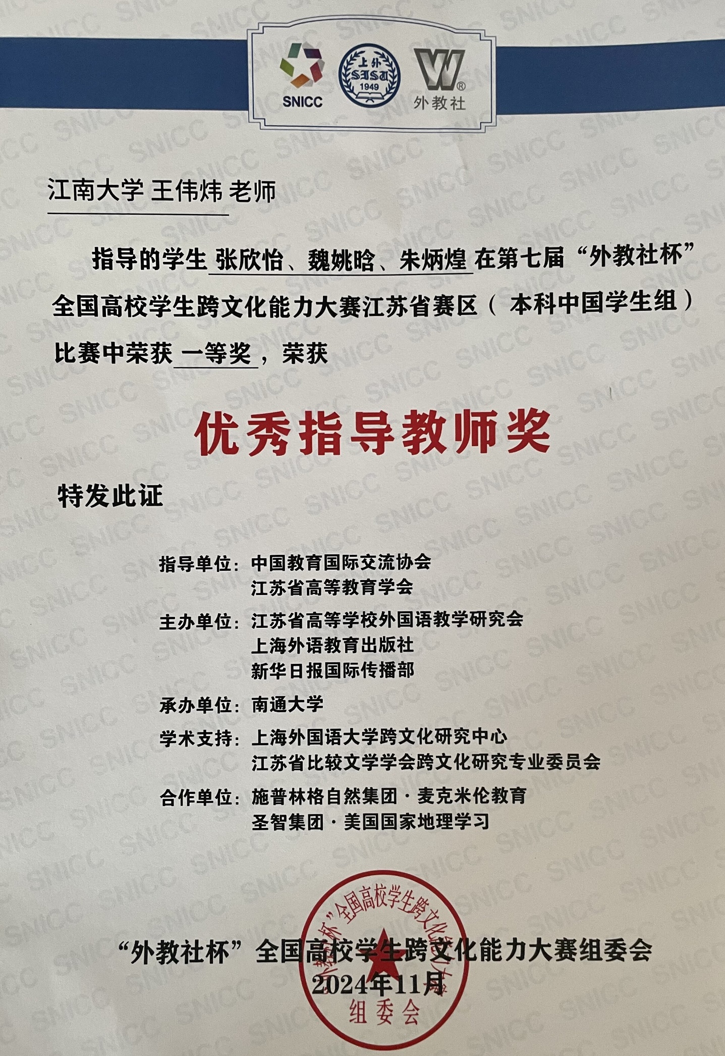 2024年11月1日至3日,第七届“外教社杯”全国高校学生跨文化能力大赛江苏省赛区比赛在南通大学成功举办。比赛分为本科中国学生组、高职中国学生组和国际学生组三个赛道,其中本科中国学生组共有包括来自南京大学、东南大学、南京理工大学、南京医科大学等43所高校的43个团队。经过激烈角逐,由我校动漫屋
