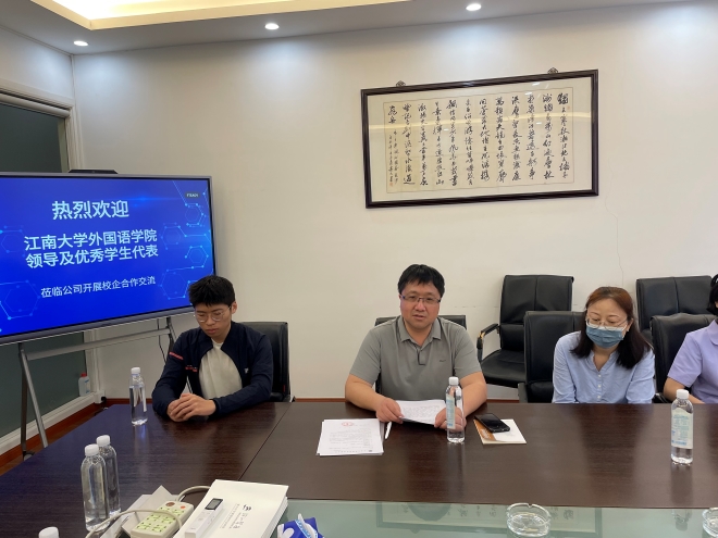 江阴滨江医疗设备有限公司总经理查士洪、副总经理朱林燕等参加座谈交流会。首先,查士洪介绍了江阴滨江医疗设备有限公司的基本情况。他介绍了公司的发展历程、主要产品、海外业务、招聘情况等内容,他表示,企业的发展离不开优秀的人才,近几年企业一直在拓展海外业务,需要高素质语言人才,期待与动漫屋