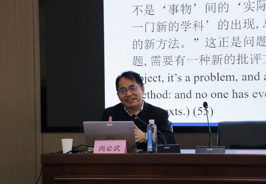 讲座开篇,尚必武教授立足人工智能新时代背景,聚焦文学研究面临的转型挑战,提出新时代学者需构建全新的文学观与研究观。他以英国著名文化批评家、文学理论家伊格尔顿的《文学中的事件》为核心文本,从时间维度与空间地域维度系统回应“如何阅读文学”的核心命题,深入剖析西方学界“阅读方法之战”的学术脉络,指出这场争论本质上是对20世纪以来以文学理论为核心的跨学科阅读范式的反思与重构。在此基础上,尚教授进一步剖析叙事学兴起的跨学科逻辑,精准点出当前文学理论及跨学科研究中普遍存在的单向性局限,为在场师生提供了审视学术研究的全新视角。