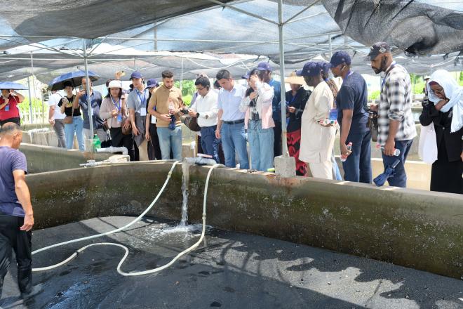 在文件翻译方面,学子们严格遵守保密条款,协助整理、翻译中英文文案资料。从水产育种、健康养殖到病害防治、水产品加工等专业领域的技术文档,到外籍学员日常生活所需的各类说明材料,学生们在精准翻译中不仅夯实了语言功底,更快速掌握了渔业领域的专业术语,实现了“语言+专业”的跨界融合。口译服务更是对学生能力的全方位考验。在外出考察水产养殖场时,学生承担着随行交替传译工作,将中方专家的养殖技术要点、场地运营经验准确传递给外籍学员;在文化课程、培训课程、NACA 国际会议等现场,学生需要协助完成会议口译,保障国际交流的顺畅高效。