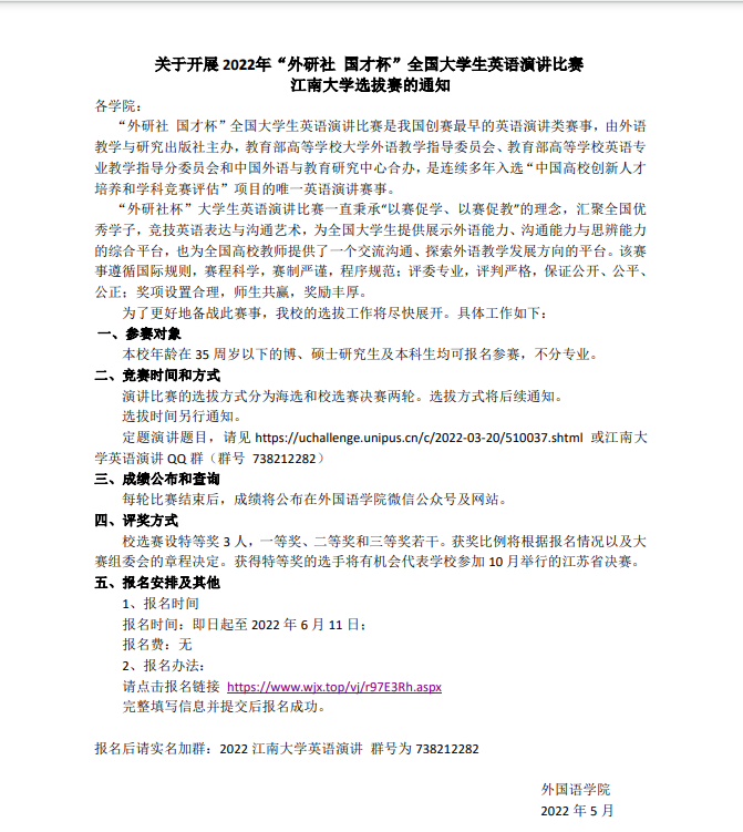 关于开展2022年“外研社 国才杯”全国大学生英语演讲比赛动漫屋 选拔赛的通知