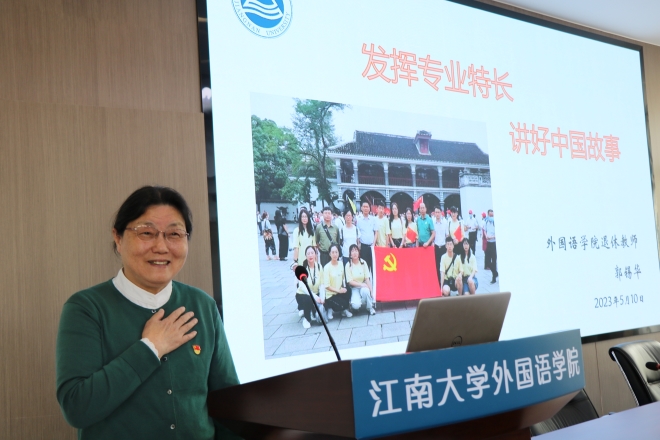 近年内发挥专业所长进行文化交流、讲好中国故事的实例。接着,又针对外语类专业适应社会发展的需要指明新文科背景下外语专业发展方向,提出抓专业质量的要求:一、优化专业结构;二、抓好质量标准;三、具备国际视野。郭老师鼓励学员们要树立远大理想,担当时代责任,与时俱进,锤炼自身能力,让青春在不断奉献中焕发光彩。